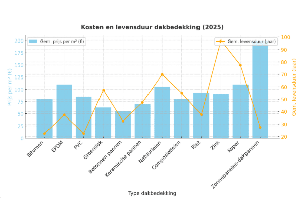 De prijs van nieuwe dakbedekking is afhankelijk van het materiaal, het type dak (plat of hellend), de oppervlakte, en eventuele extra werkzaamheden zoals isolatie. Onderstaande tabel geeft een indicatie van de gemiddelde prijzen inclusief plaatsing en btw.