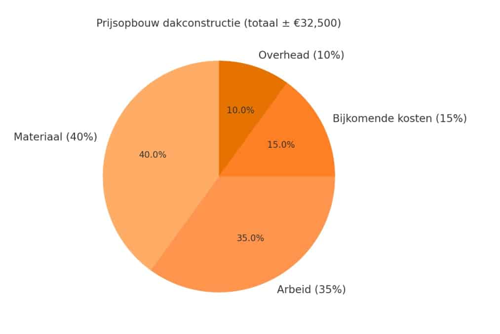 De kosten van een dakconstructie bestaan doorgaans voor ongeveer 40% uit materiaal (hout, staal, isolatie, dakbedekking), 35% uit arbeid voor montage en afwerking, 15% uit bijkomende kosten zoals steigerwerk en transport, en 10% uit algemene bouw- en overheadkosten. Bij een gemiddelde eengezinswoning van circa 120 m² komt de totale prijs voor de dakconstructie uit op ongeveer €30.000 tot €35.000, afhankelijk van de gekozen materialen en uitvoering.