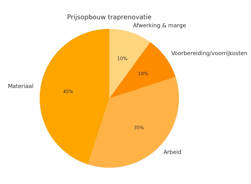 De prijsopbouw van een traprenovatie bestaat doorgaans uit verschillende onderdelen: ongeveer 40–50% van de kosten gaat naar het materiaal (zoals overzettreden, stootborden en eventueel antislipstrips), 30–40% naar de arbeidskosten voor montage en afwerking, 5–10% naar voorbereiding en voorrijkosten (zoals het verwijderen of egaliseren van de oude trap), en 5–10% naar bijkomende zaken zoals afwerking, kitwerk en marge.