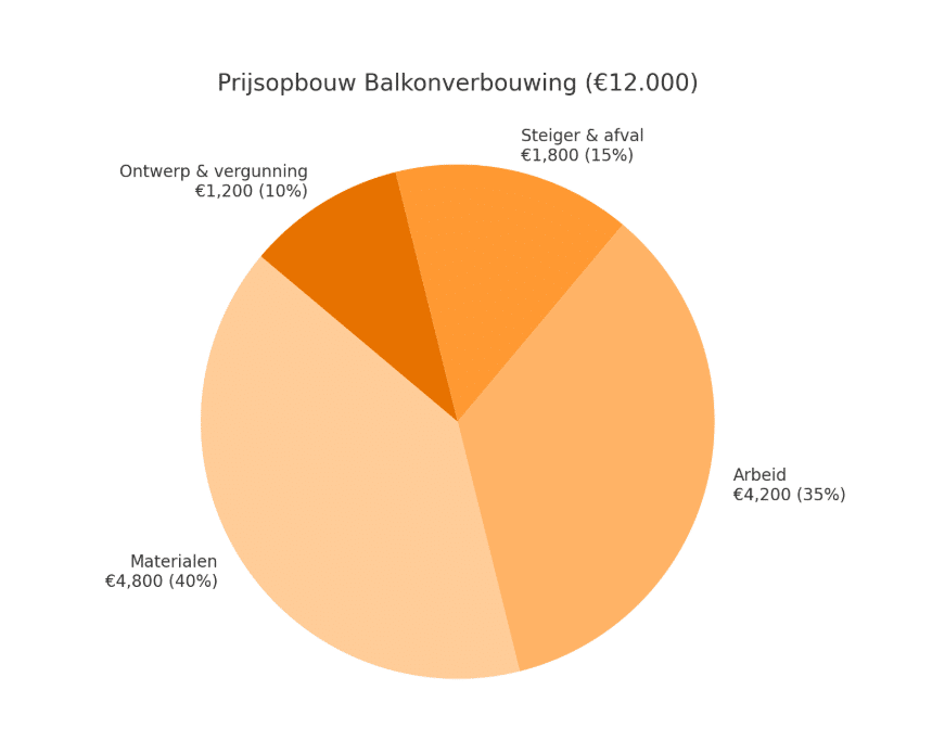 De totale kosten voor het verbouwen van een balkon van circa 8 m² bedragen in dit voorbeeld €12.000. Hiervan gaat ongeveer 40% (€4.800) naar materialen (betonherstel, tegels, reling), 35% (€4.200) naar arbeidskosten van aannemer en vaklieden, 15% (€1.800) naar steigerhuur, transport en afvalverwerking, en 10% (€1.200) naar ontwerp, vergunningen en onvoorziene kosten. Deze verdeling kan natuurlijk variëren afhankelijk van de staat van het balkon, de gekozen afwerking en de gemeente-eisen.