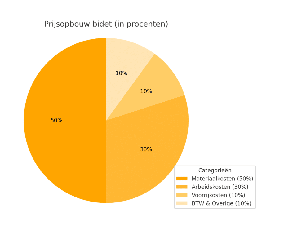 De prijsopbouw voor het plaatsen van een bidet bestaat doorgaans uit verschillende onderdelen: ongeveer 50% materiaalkosten, 30% arbeidskosten, 10% voorrijkosten en 10% btw en overige kosten (zoals klein materiaal en afvalverwerking). Stel dat de totale kostprijs €800 bedraagt, dan komt dit neer op circa €400 aan materialen (zoals het bidet, kraan en aansluitingen), €240 aan arbeid voor installatie, €80 aan voorrijkosten en €80 aan btw en overige kosten. Deze verdeling kan variëren afhankelijk van het type bidet, merk, en de staat van de bestaande leidingen.