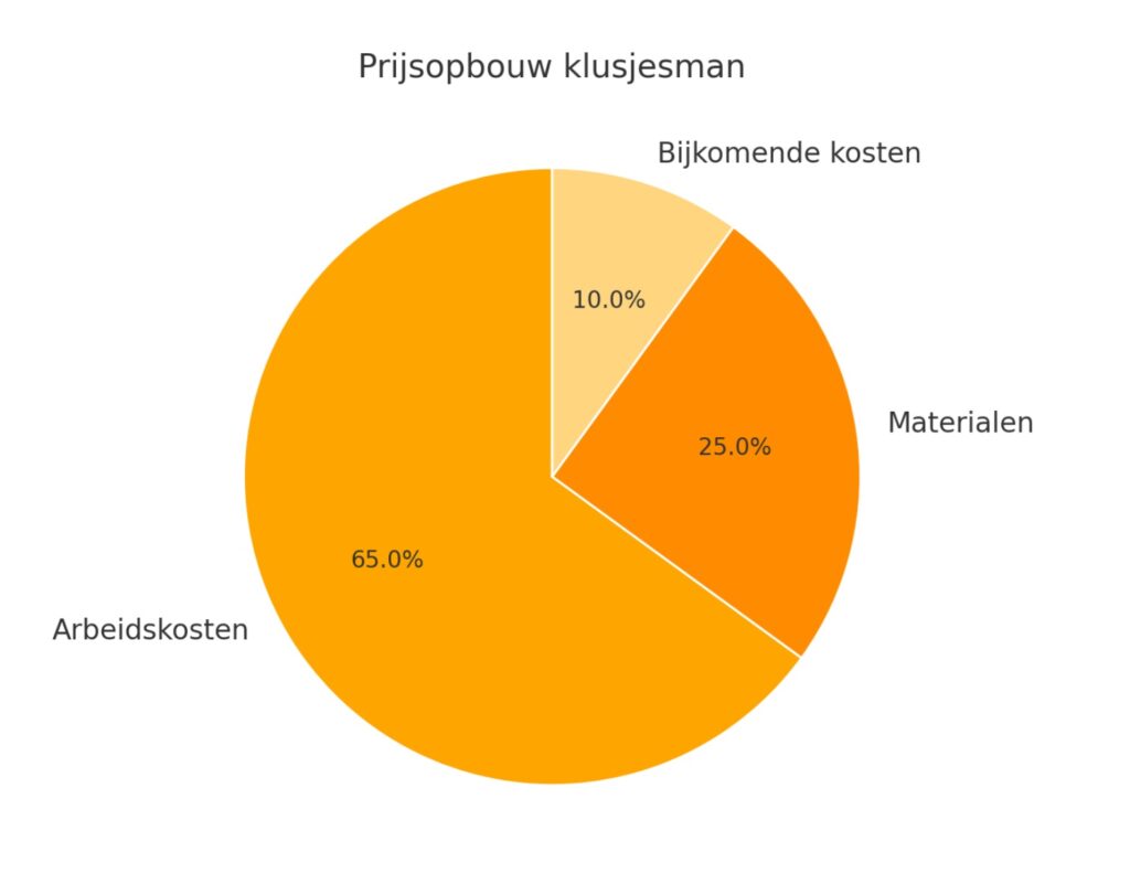 Bij het inschakelen van een klusjesman bestaat de prijsopbouw doorgaans uit 60–70% arbeidskosten, aangezien zijn tijd, ervaring en inzet het belangrijkste deel vormen van de dienstverlening. Ongeveer 20–30% gaat naar materialen en klein gereedschap die nodig zijn voor de klus, variërend van schroeven en lijm tot hout of verf. Tot slot is er vaak 5–10% voor bijkomende kosten zoals vervoer, voorbereiding, afvalafvoer of administratie. Deze verdeling kan natuurlijk verschillen afhankelijk van de omvang van de klus, de gebruikte materialen en de reistijd van de klusjesman.