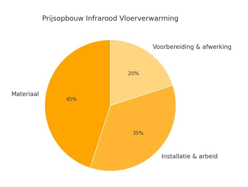 De prijsopbouw van infrarood vloerverwarming bestaat grofweg uit drie delen: het materiaal (panelen of folie, regeltechniek en isolatie) neemt meestal zo’n 40–50% van de totale kosten in beslag, de installatie en arbeidsuren vormen ongeveer 30–40%, en bijkomende kosten zoals voorbereiding (vloer egaliseren, elektriciteitsaanpassingen) en afwerking bedragen doorgaans 10–20%. Het exacte percentage kan variëren afhankelijk van de vloeroppervlakte, de complexiteit van de ruimte en de gekozen kwaliteit van de materialen.