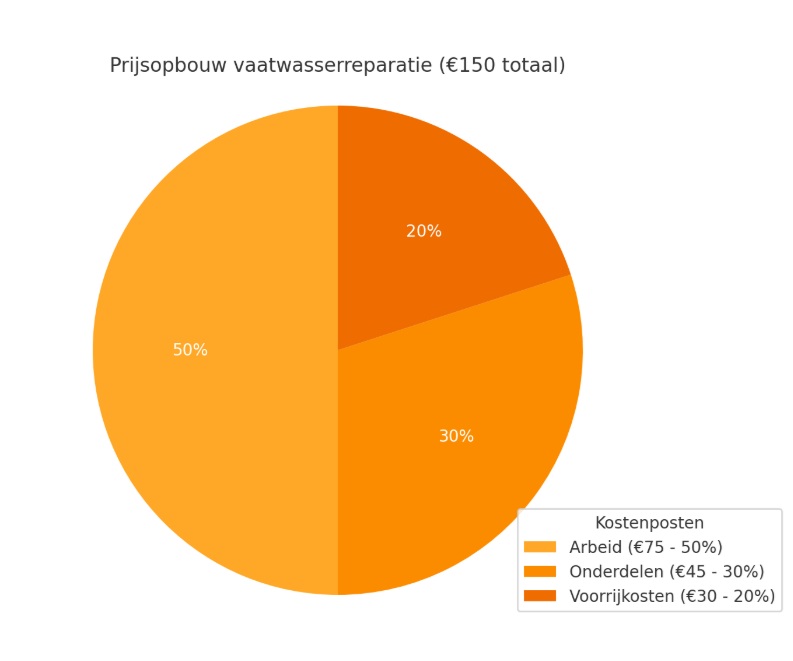 De prijsopbouw voor het repareren van een vaatwasser bestaat meestal uit verschillende onderdelen. Ongeveer 50% van de totale kosten gaat naar arbeidsloon, zoals de diagnose en het uitvoeren van de reparatie. 30% bestaat uit onderdelen, bijvoorbeeld een nieuw verwarmingselement, pomp of elektronisch paneel. De resterende 20% zijn voorrijkosten en administratiekosten, zoals transport en planning. Stel dat de totale prijs €150 bedraagt: dan betaal je ongeveer €75 voor arbeid, €45 voor onderdelen en €30 voor voorrijkosten. Deze verdeling kan natuurlijk variëren afhankelijk van het merk van de vaatwasser en de aard van de storing.