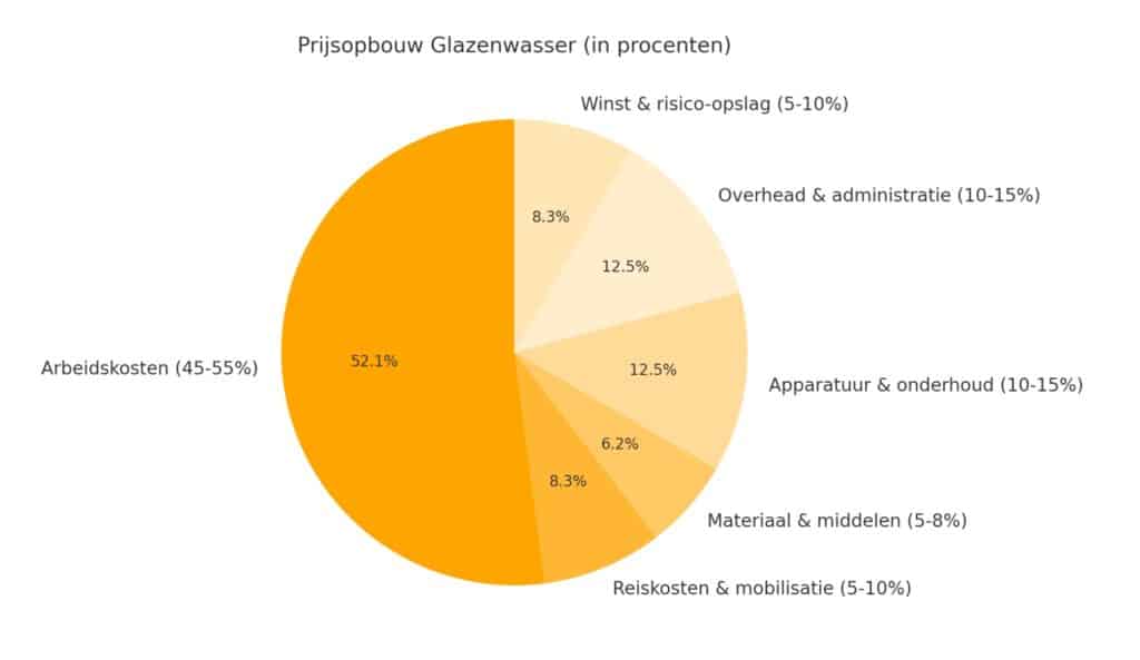 De prijsopbouw van een glazenwasser bestaat grofweg uit 45–55% arbeidskosten, 5–10% reiskosten en mobilisatie, 5–8% materiaal en schoonmaakmiddelen, 10–15% voor apparatuur en onderhoud (zoals ladders, hoogwerkers en osmose-installaties), 10–15% overhead en administratie, en een winstmarge met risico-opslag van circa 5–10%.