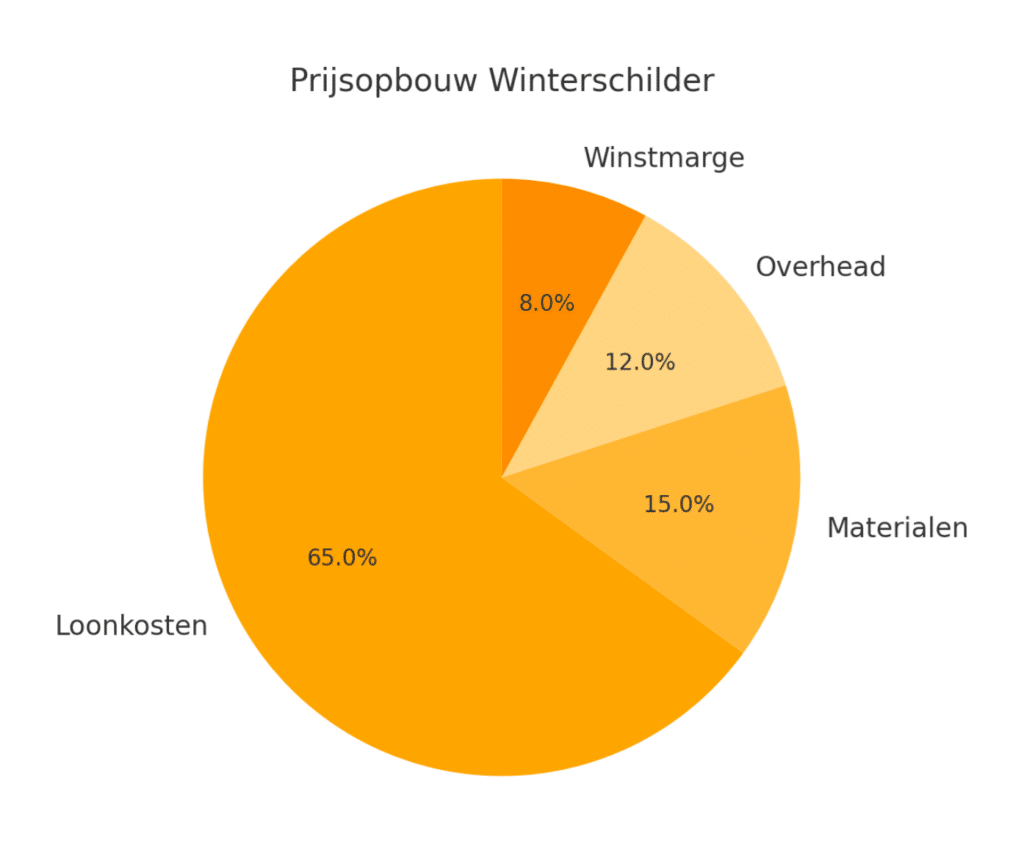 De prijsopbouw van een winterschilder bestaat gemiddeld uit ongeveer 60–70% loonkosten, aangezien schilderwerk arbeidsintensief is. Ongeveer 15–20% gaat naar materialen zoals verf, lak, kwasten en afplaktape. Daarnaast komt 10–15% voor overhead en algemene kosten, zoals vervoer, gereedschap en verzekeringen. De winstmarge van de schilder bedraagt doorgaans 5–10%. In de winterperiode bieden veel schilders een korting (meestal rond de 10–20%), waardoor de loonkostenfactor iets lager kan uitvallen.