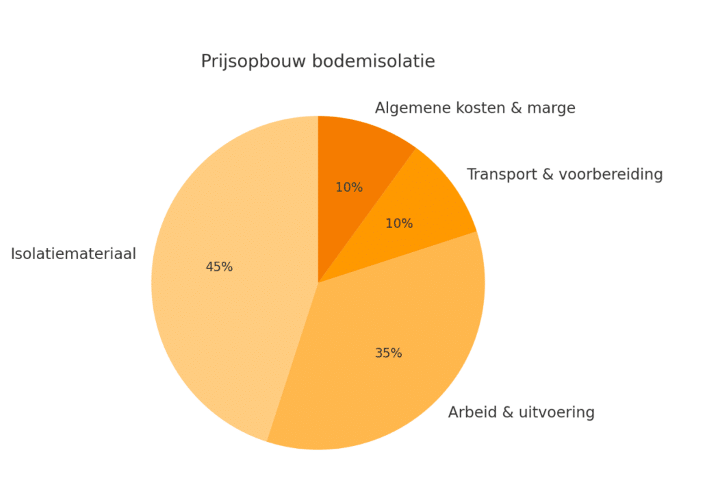 Ongeveer 45% van de kosten gaat naar het isolatiemateriaal zelf (bijvoorbeeld schelpen of isolatiechips), 35% naar arbeidsuren en uitvoering (het inblazen en verdelen van het materiaal), 10% naar transport en voorbereiding (aanvoer materiaal, bereikbaarheid kruipruimte) en 10% naar algemene kosten en marge van de isolateur (planning, administratie, winst).