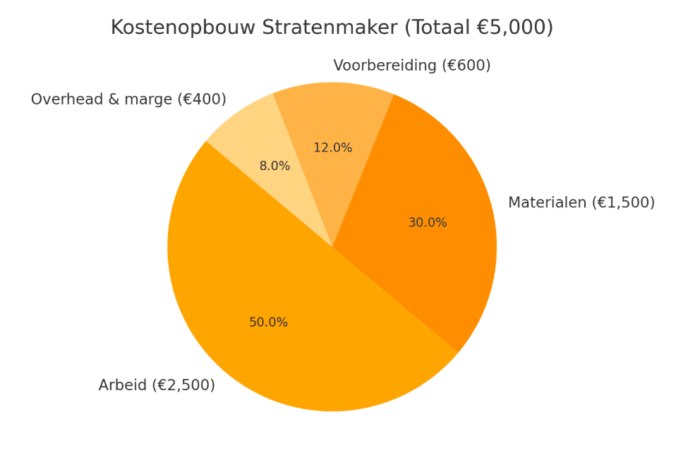 De prijsopbouw van een stratenmaker bestaat doorgaans voor 45–55% uit arbeid (uurtarief of vierkante-meterprijs voor het leggen), 25–35% uit materialen (klinkers, tegels, opsluitbanden en zand), 10–15% uit voorbereidende werkzaamheden (grondwerk, egaliseren, afvoer) en 5–10% uit overhead en marge.