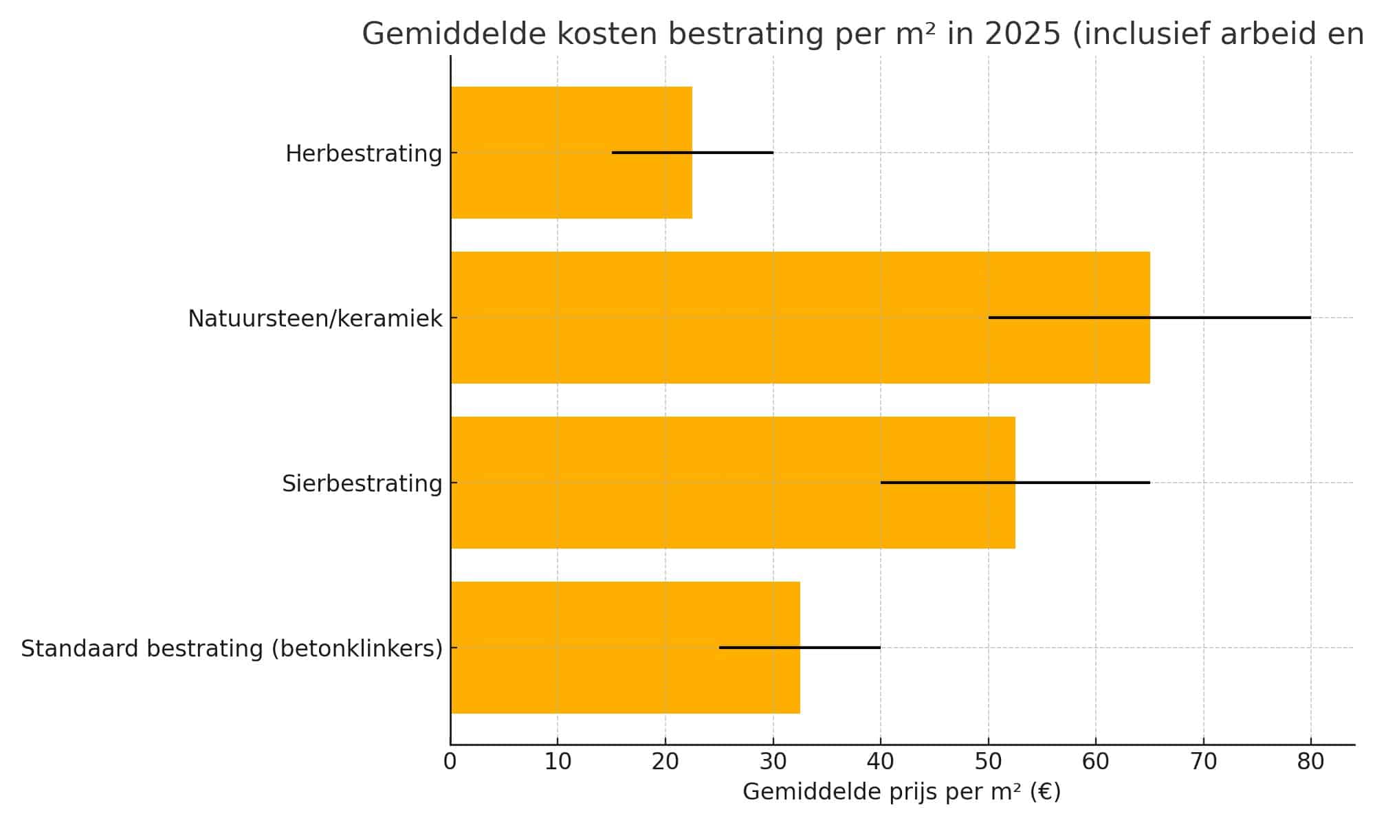 Luxe bestrating / natuursteen / keramiek of speciale patronen | € 100 – € 200+ per m² | 20 m² | € 2.000 – € 4.000+ | Voor topkwaliteit steen, precieze afwerking, bijzondere vormen |