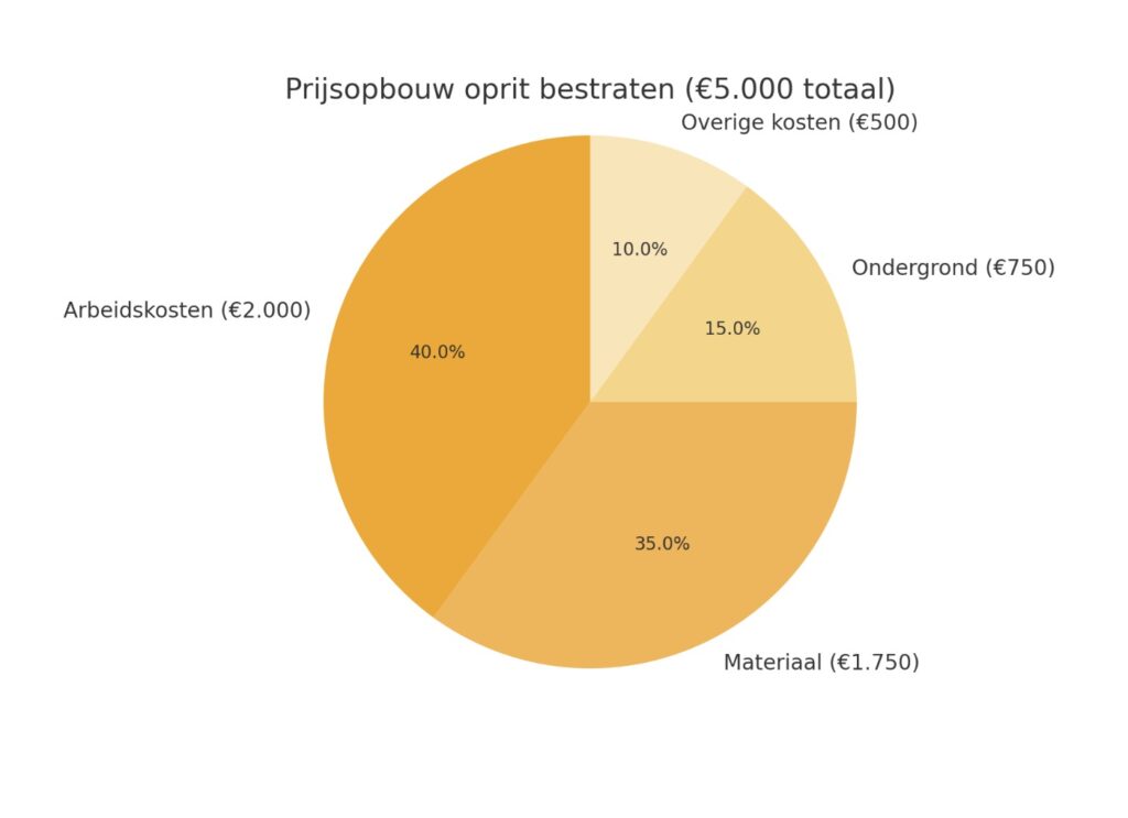 De totale kosten voor het bestraten van een oprit bedragen ongeveer €5.000, waarvan 40% (€2.000) naar arbeidskosten gaat voor het uitgraven, egaliseren en leggen van de bestrating. Ongeveer 35% (€1.750) bestaat uit materiaal- en bestratingskosten, zoals klinkers of tegels. 15% (€750) gaat op aan voorbereidende werkzaamheden en ondergrondmateriaal, zoals zand, grind en opsluitbanden. De resterende 10% (€500) zijn overige kosten, waaronder afvalafvoer, transport en eventueel huur van machines.